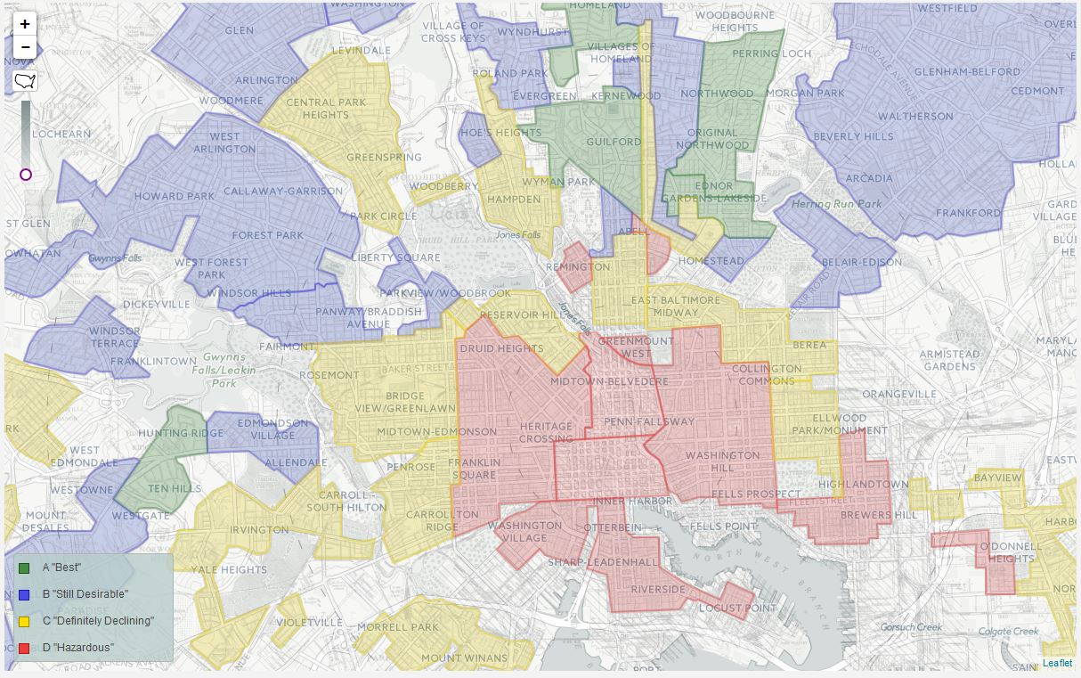 A Homeowner’s Loan Corporation map for Baltimore shows how much of the housing in the inner city was “redlined” – systematically disfavored for financial services.The suburban development of Roland Park is located at the top center of the map. Digital Scholarship Lab, Mapping Inequality.